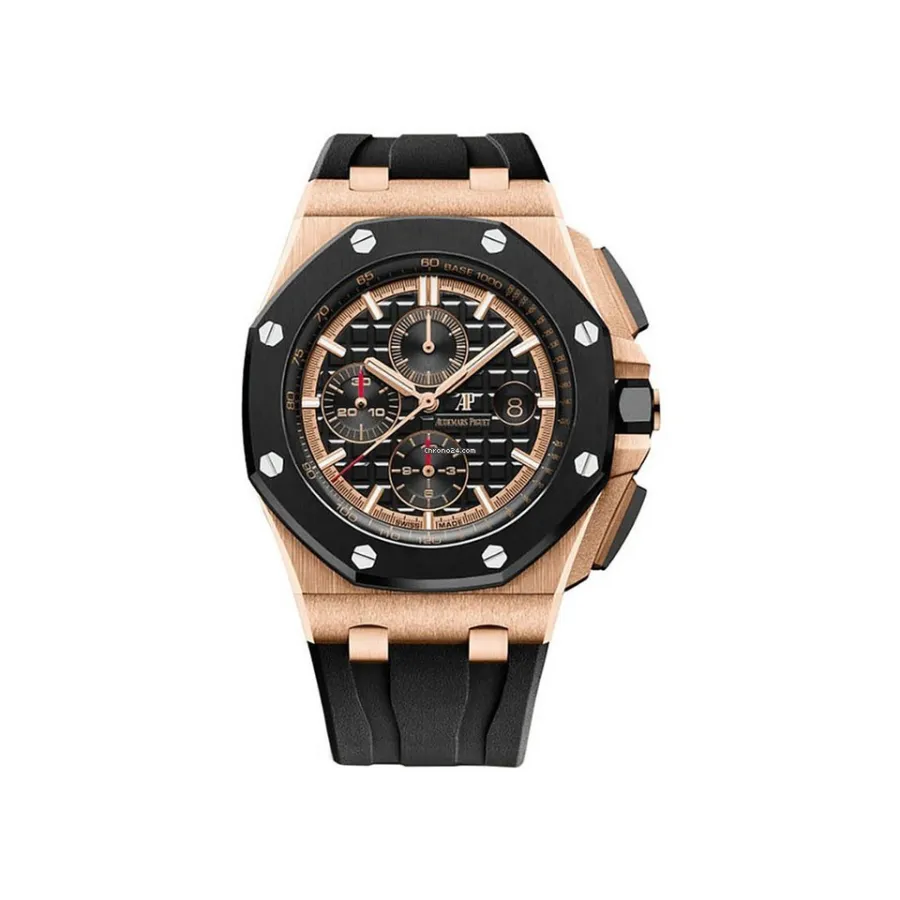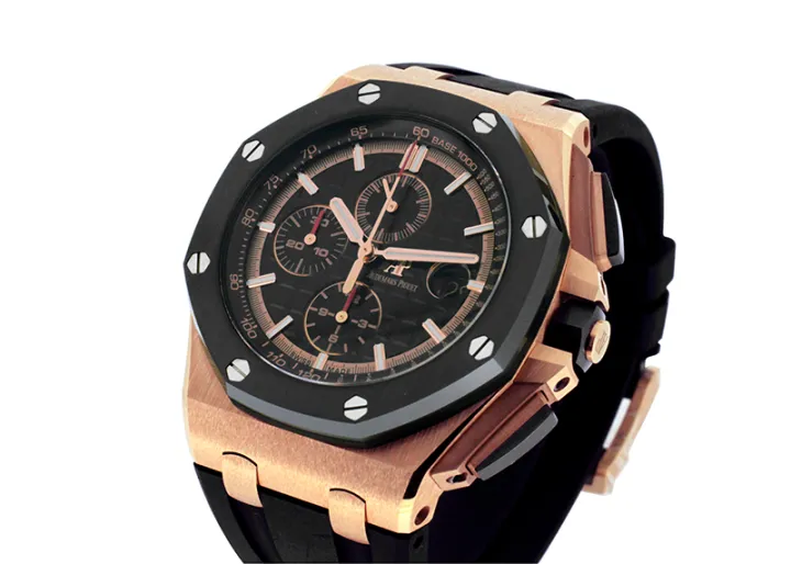文字盤の材質の黒い文字盤は“M e gaTapisserie”を刻みます。大きなチェックの装飾にはバラゴールドの外地、黒いサブバンド、ローズゴールドの材質が立体的に見える時の表示とロイヤルオークの針、黒い内輪