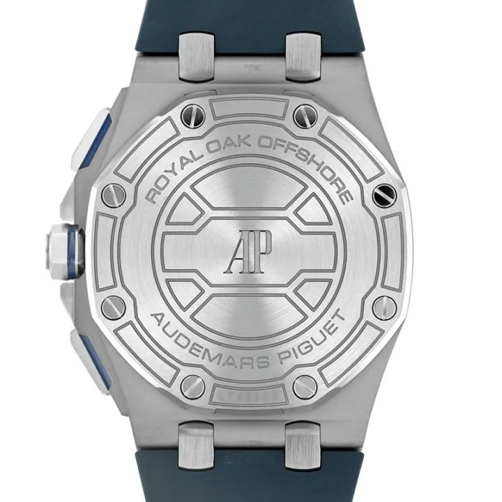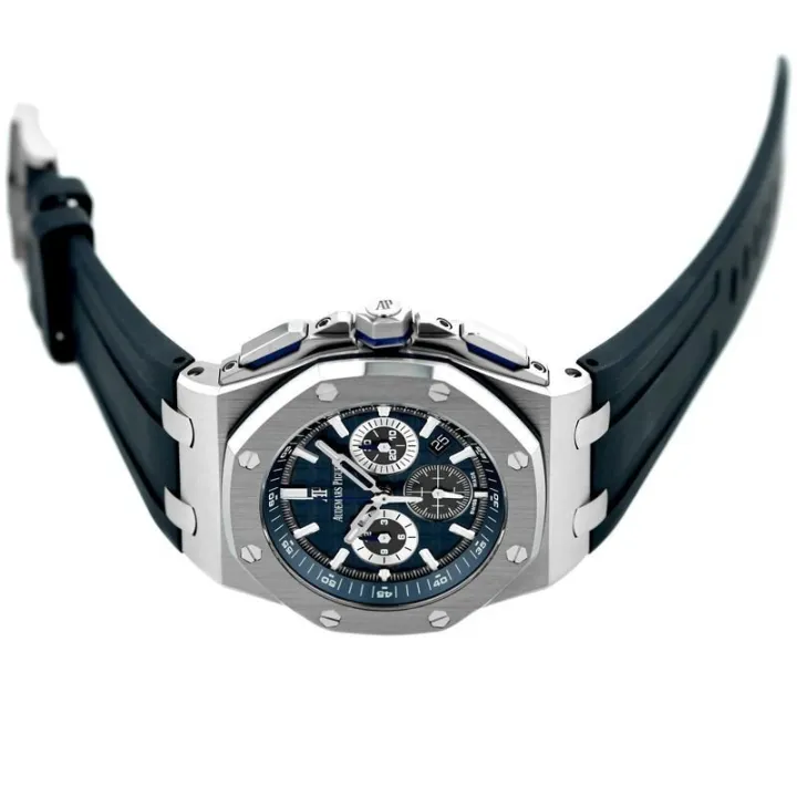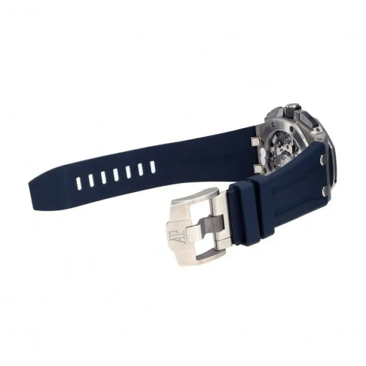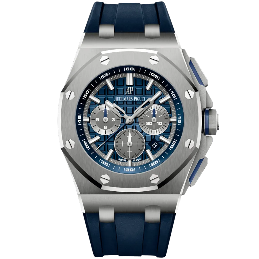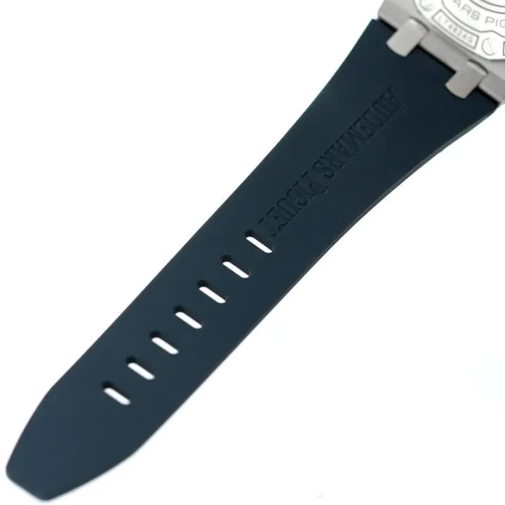 文字盤の材質が刻まれている“M e gaTapisserie”超大型のチェック模様が飾られています。灰色の副文字盤とプラチナ蛍光立体時の表示とロイヤルオークの針を合わせて、ブルーの内周時計