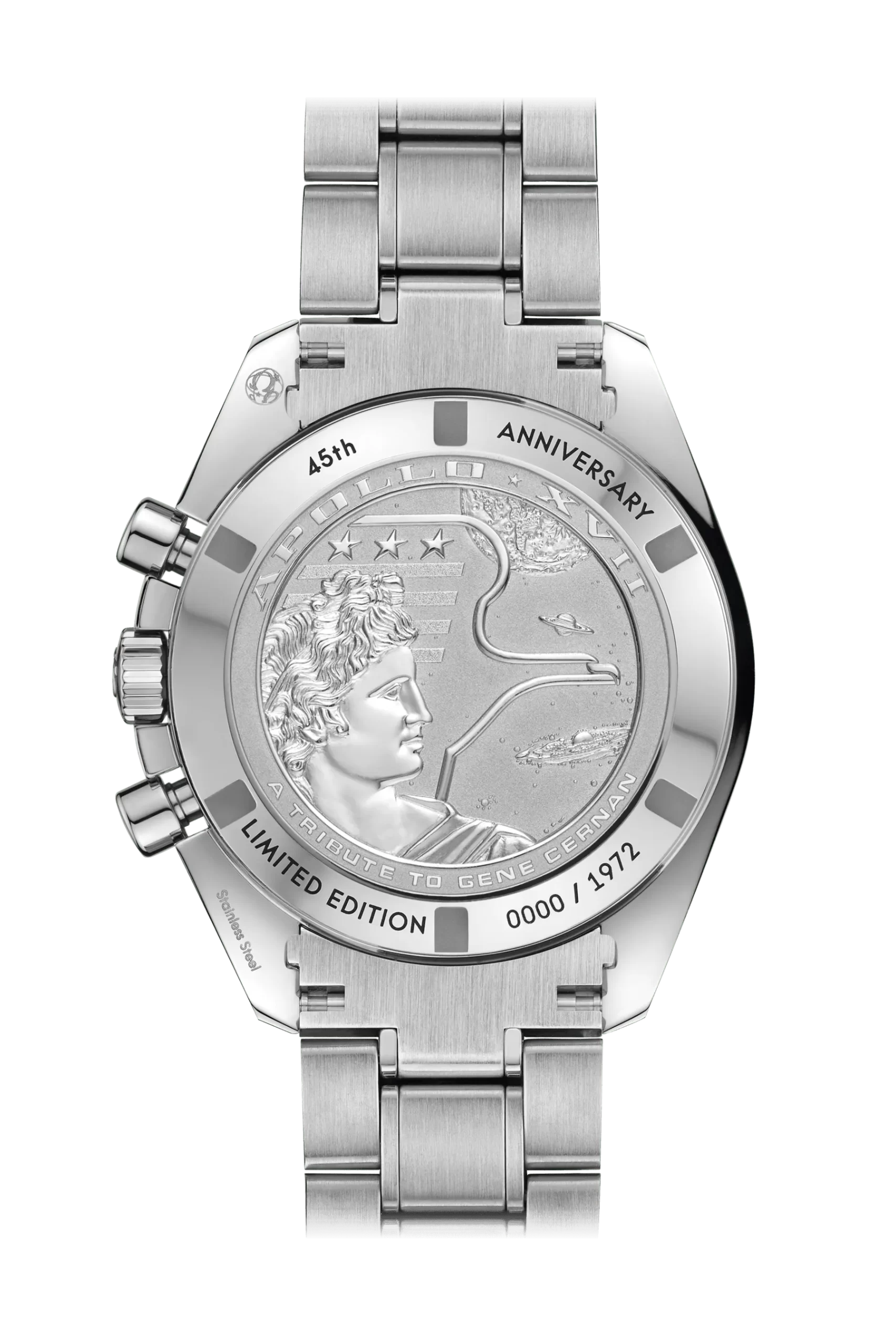 ステンレススティール製のブレスレットが合わせられたこのウォッチは、アイコニックなオメガ キャリバー1861を搭載しています。ケースバックには、「45th ANNIVERSARY」と「Limited Edition」の文字と、一点ごとの製造番号が刻印されています。アポロ17号のパッチの「APOLLO XVII」と「a tribute to Gene Cernan」(ジーン・サーナン船長に捧ぐ)の文字は、エンボス加工で施されています。
