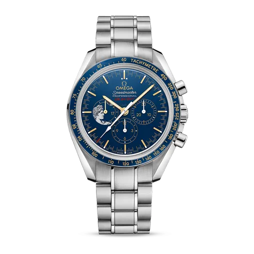 42mmのステンレススティール製ケースに、ポリッシュ仕上げのブルーのセラミック製ベゼル、オメガ セラゴールド™技術を反映したタキメータースケールが搭載されています。ダイアルにもポリッシュ仕上げのブルーのセラミックが使用され、18Kイエローゴールド製インデックスと時針・分針の「ムーン」針にはスーパールミノヴァが塗布されています。