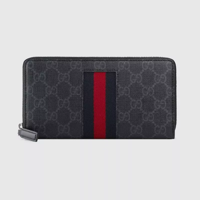 2つの認識可能なグッチのロゴ-GGパターンとウェビングは慎重に一致し、製造されています。このフルジップウォレットは、ブランドのストライプウェビングを備えたGGSupremeキャンバスで作られています。