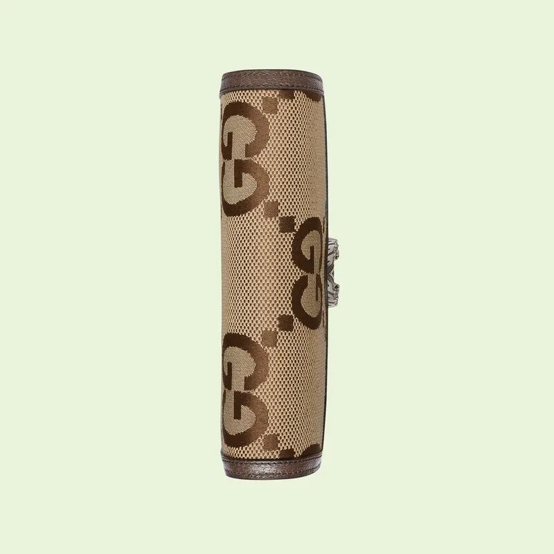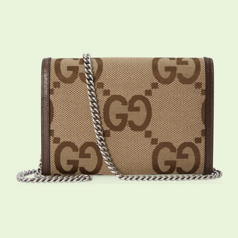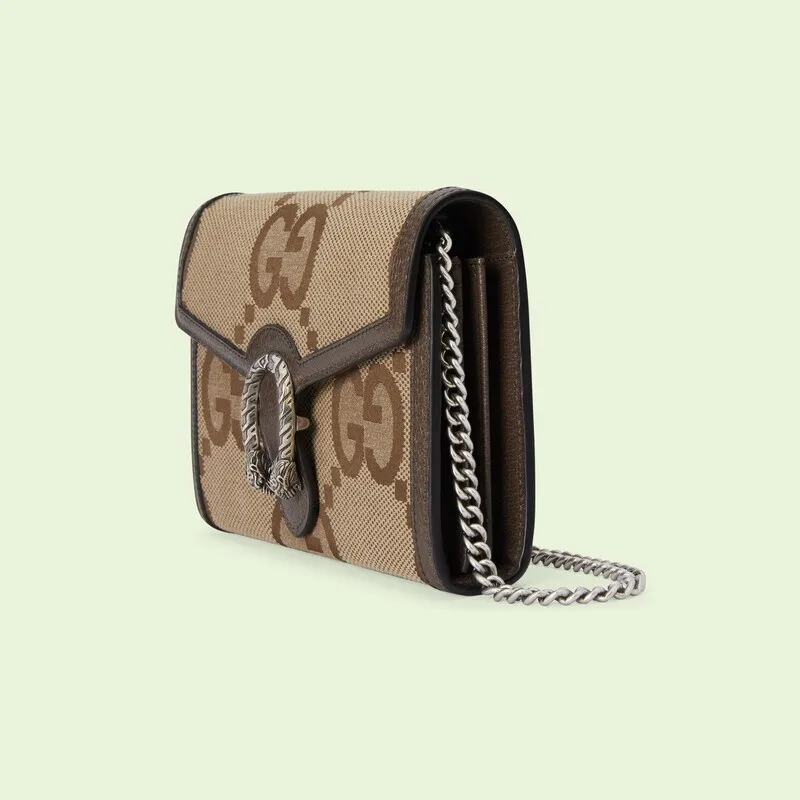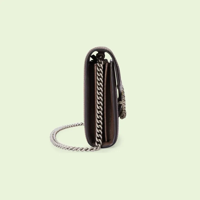 GGモチーフは、1960年代後半にブランドのコレクションに最初に登場しました。 それ以来、この文字パターンは進化し続けています。 スーパーダブルGモチーフは、グッチの「アリアファッションアリア」シリーズに初登場し、「グッチマーチオブラブ」シリーズでは、ロゴが華やかに戻ってきました。 ディオニュソスチェーンウォレットは、この特大バージョンのグラフィックを特徴としており、コレクションのシグネチャーアクセサリーと茶色の革のパイピングを補完します。