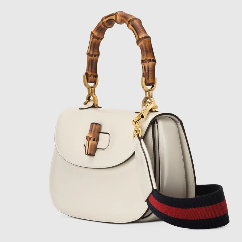 竹の結び目は、グッチの永続的なデザイン遺産を象徴しています。 この鞄の竹の柄は炎の熱で曲がって形作られています。 この工芸品は、第二次世界大戦後のフィレンツェの職人から生まれました。 ハンドバッグは、取り外し可能なウェビングショルダーストラップ付きの白い革でできており、肩や手に持ち運べる用途の広い持ち運びオプションを作成します。 グッチの「アリア-ファッションアリア」シリーズは、時代を超えたクラシックなアイテムを解釈するためにさまざまな着用方法を使用して、実用的で用途の広いデザインに焦点を当てています。