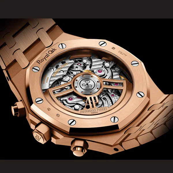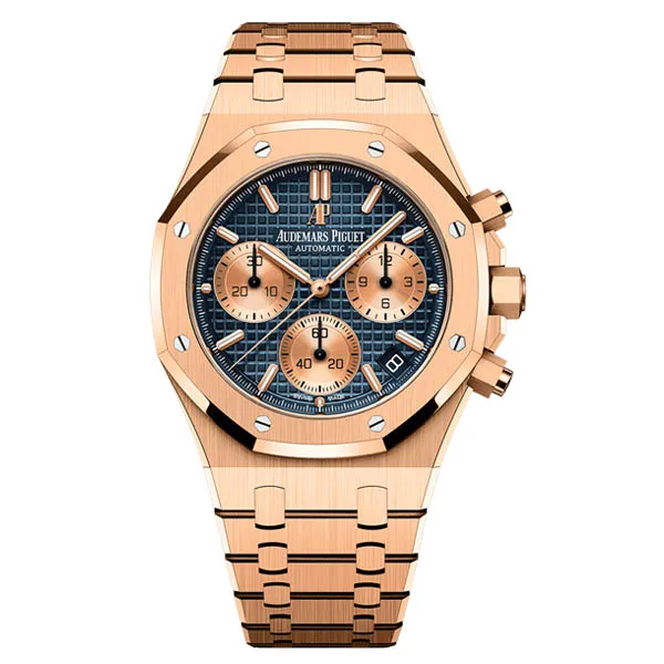 「グランドタペストリー」模様のブルーダイヤル、ピンクゴールドカラーのカウンター、蓄光処理を施したピンクゴールドのアプライドアワーマーカーとロイヤルオーク針