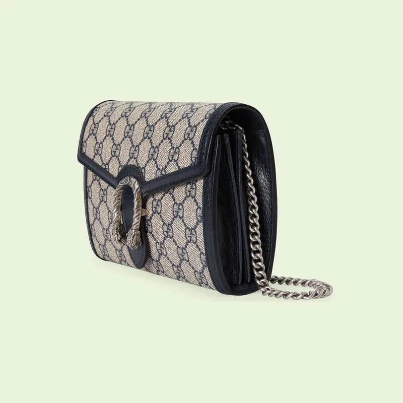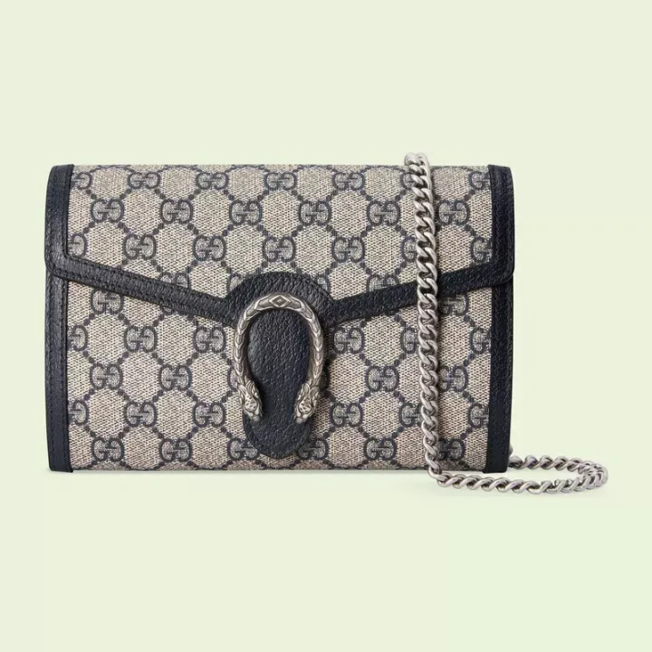 新しいファッションシリーズ「グッチラブマーチ」では、GG Supremeキャンバスが、素材の歴史的起源を継承し、ブルーとベージュのクラシックで時代を超越した組み合わせを発表しました。 環境への影響が少ないキャンバス素材は、古くから多くのシリーズで使用されており、ブランドの象徴的な素材となっています。 このディオニュソスチェーンウォレットは、クラシックなカラーウェイで提供されます。