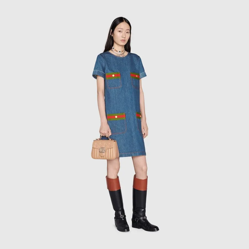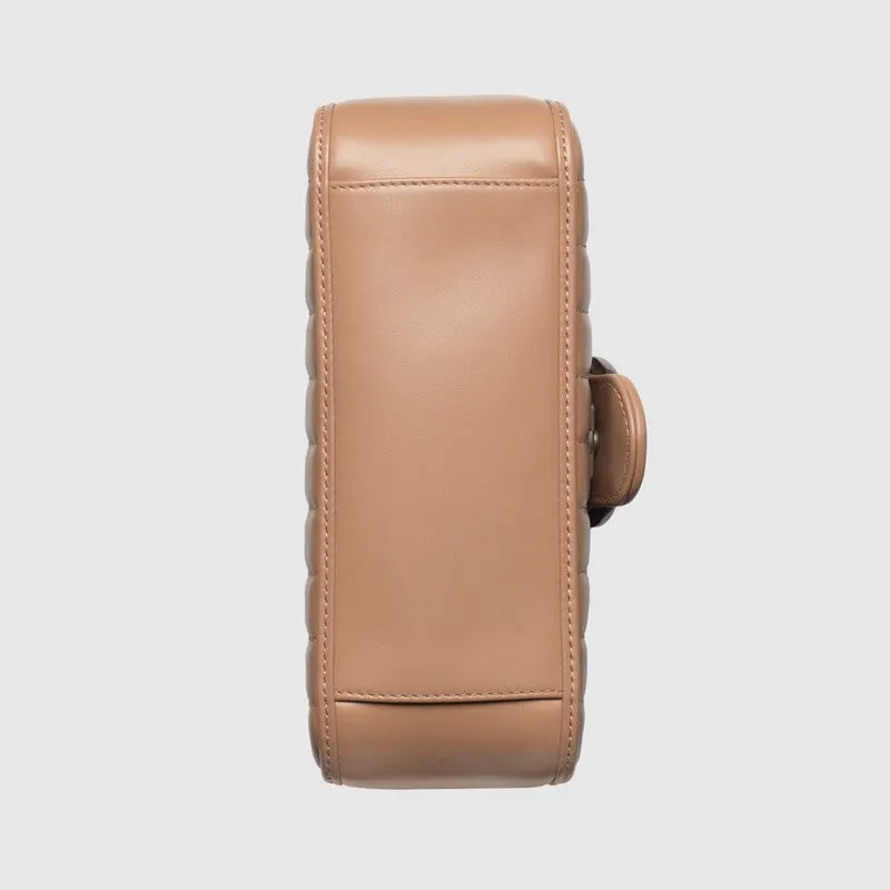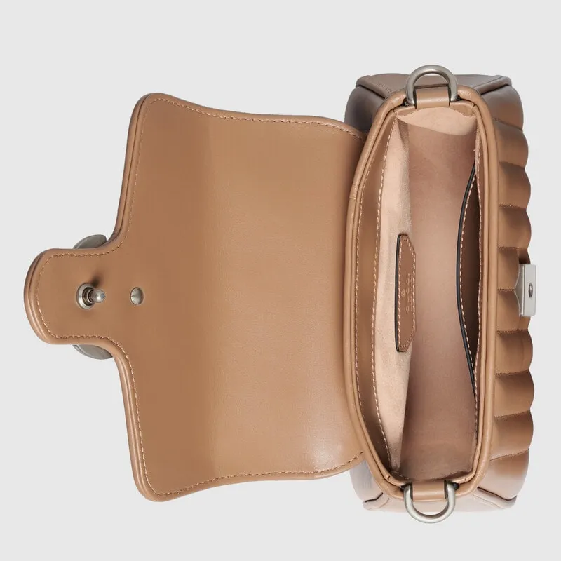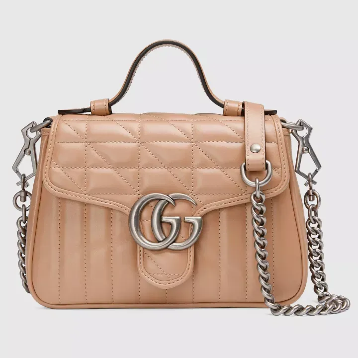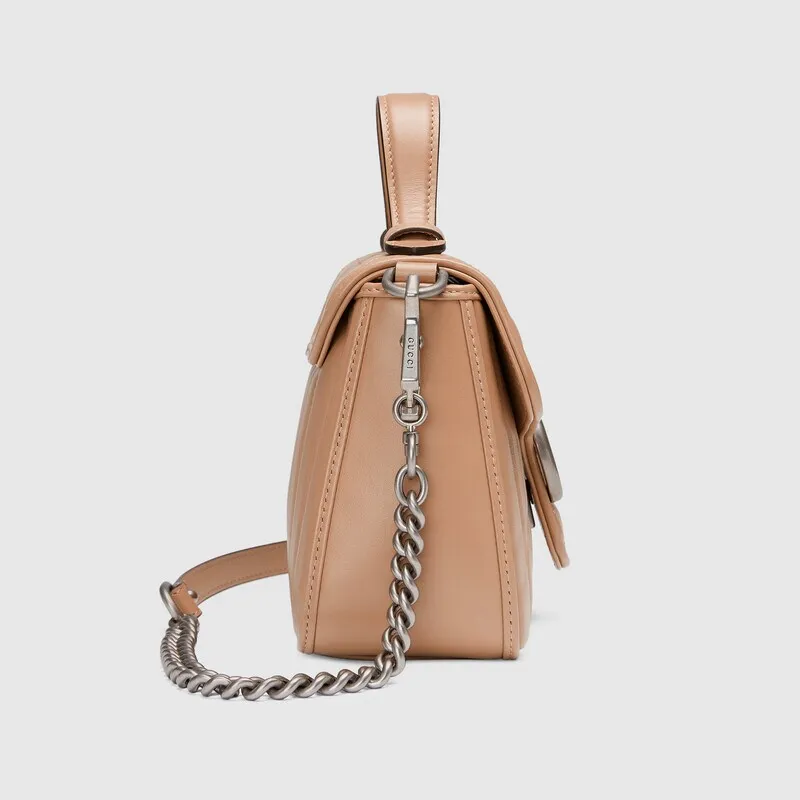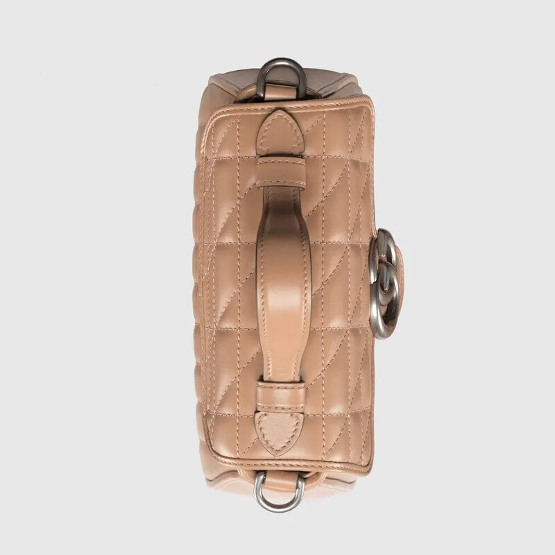 グッチの「アリア-ファッションアリア」シリーズは、ブランドのアーカイブの要素を探求し続け、クラシックとモダンな技術の融合を通じてグッチのデザインの物語を語っています。 GGマーモントシリーズは、キャリアの初期にブランドのクリエイティブディレクターによって作成された代表的な作品であり、毎シーズン、新鮮な視点からより多くの意味合いと新しいアイデアを取り入れます。 このミニバッグは、ヴィンテージ風のアンティークシルバートーンのハードウェアを備えた、フレッシュなローズベージュのキルティングレザーで作られています。