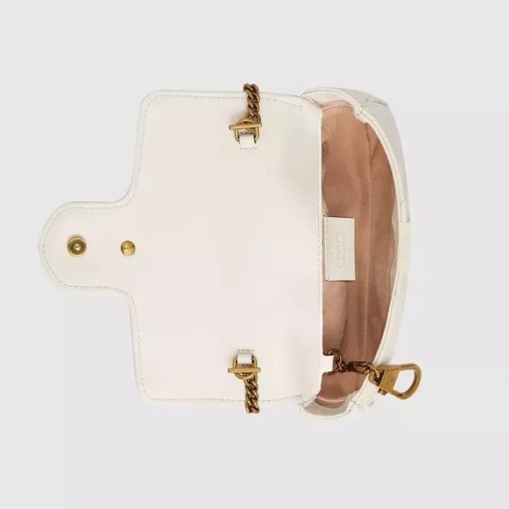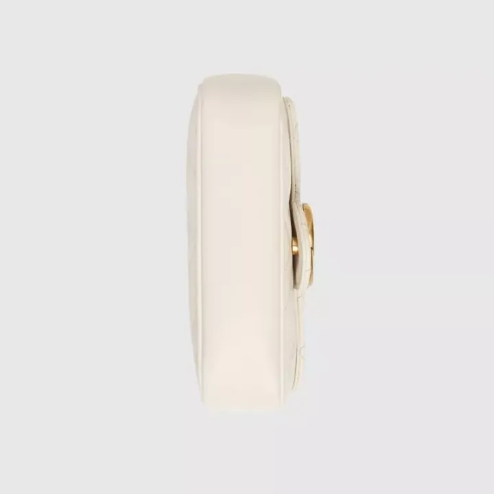 このGGマーモントシリーズのミニバッグは、白いキルティングレザーでできており、柔らかくてパリッとした形をしています。 同時に、1970年代のコレクションデザインにインスパイアされた立体的なディテールから派生した、シリーズの象徴的なダブルG要素で装飾されています。