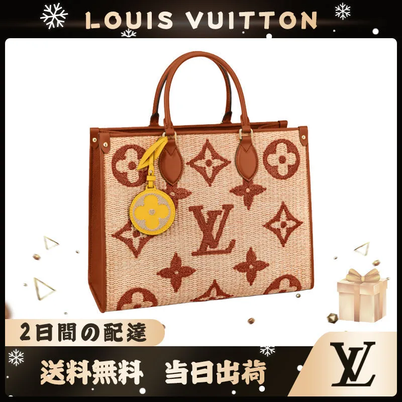 モノグラムラフィア テキスタイルを使用し、レザーハンドル、ショルダーストラップ、マチ付きで仕上げた「オンザゴー MM」。旅行やビーチに最適なバッグです。リサイクルされたコットンと持続可能な方法で調達されたビスコースを組み合わせたモノグラムラフィアに、モノグラムジャイアント パターンの刺繍をあしらいました。取外し可能なコントラストカラーのバッグチャームが彩りを添えます。