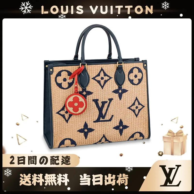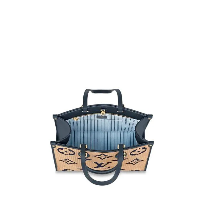 モノグラムラフィア テキスタイルを使用し、レザーハンドル、ショルダーストラップ、マチ付きで仕上げた「オンザゴー MM」。旅行やビーチに最適なバッグです。リサイクルされたコットンと持続可能な方法で調達されたビスコースを組み合わせたモノグラムラフィアに、モノグラムジャイアント パターンの刺繍をあしらいました。取外し可能なコントラストカラーのバッグチャームが彩りを添えます。