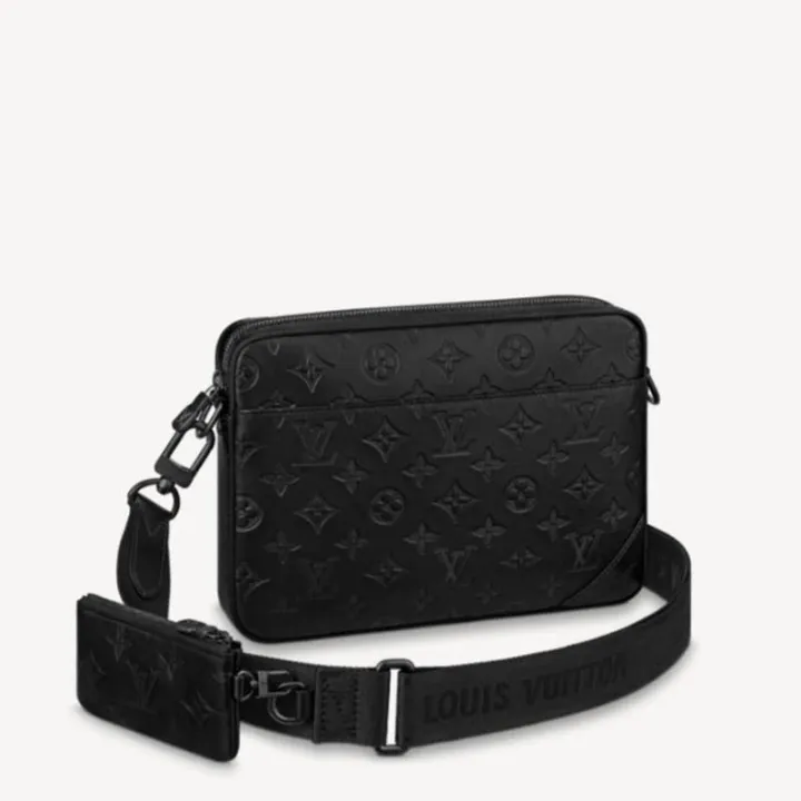 モノグラムシャドウ レザーを使用したメンズバッグ「デュオメッセンジャー」。ストラップに取外し可能なコインパースが付いたハイブリッドなクロスボディバッグです。アイコニックなモノグラムパターンをさりげなくエンボス加工したモノグラムシャドウ レザーが、バッグのモダンなデザインに控えめなエレガンスを添えます。