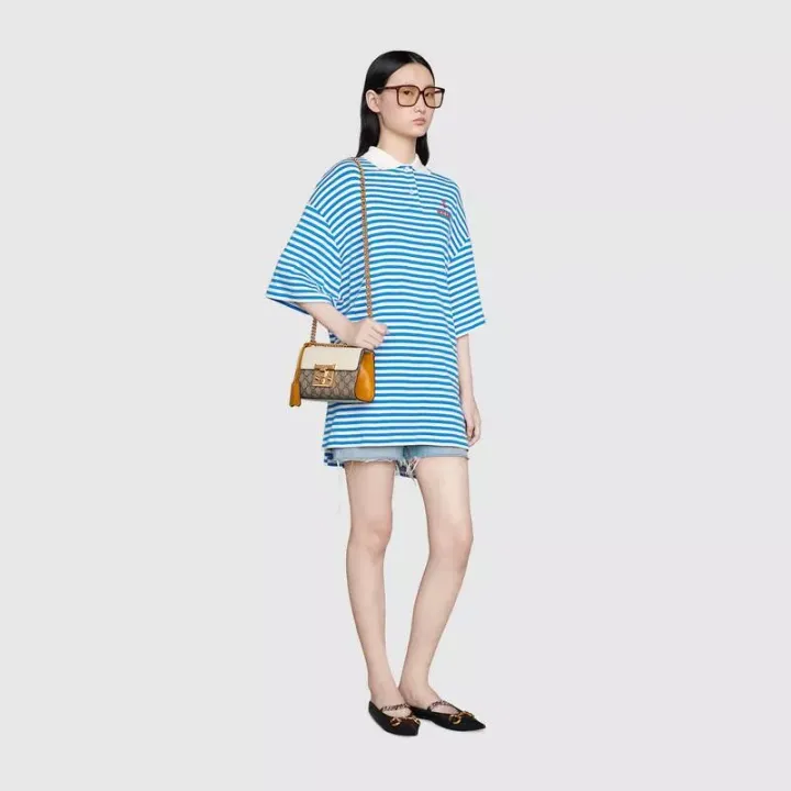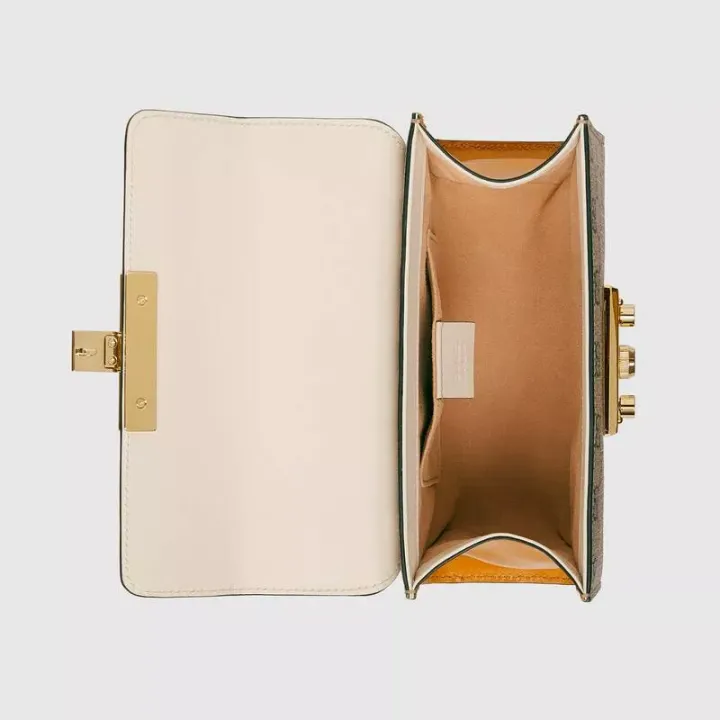 この小さな南京錠のショルダーバッグは、くっきりとした形をしていて、GGSupremeキャンバスと白い革でできています。 ハンドバッグは、カジュアルラゲッジの世界でのブランドのデザインの起源を彷彿とさせるシリーズの象徴的な南京錠のバックルで飾られています。