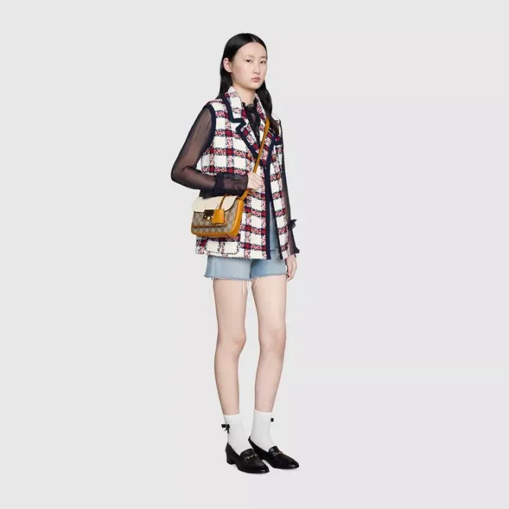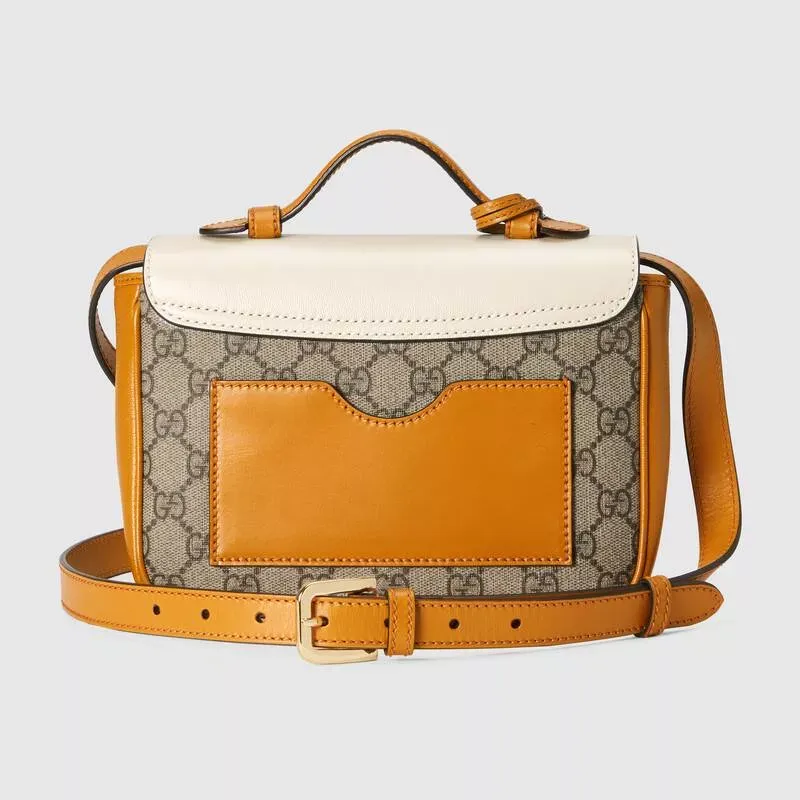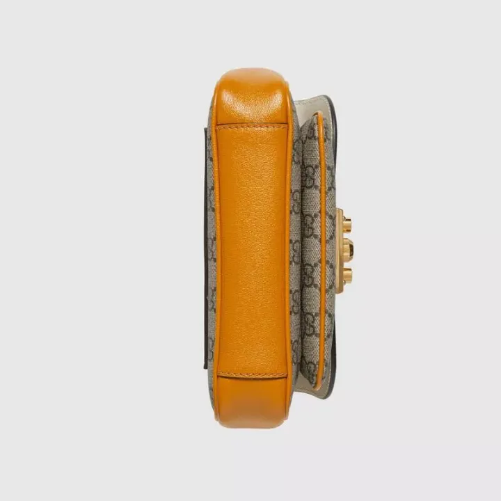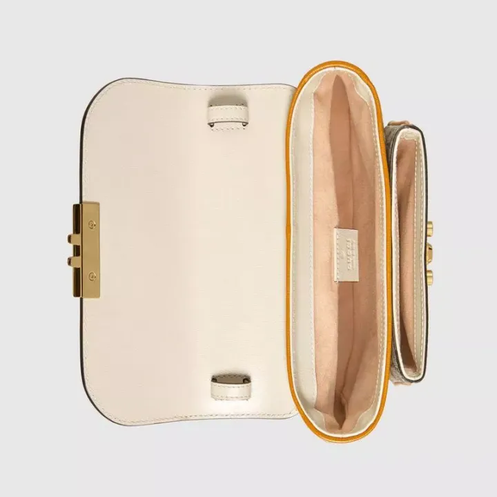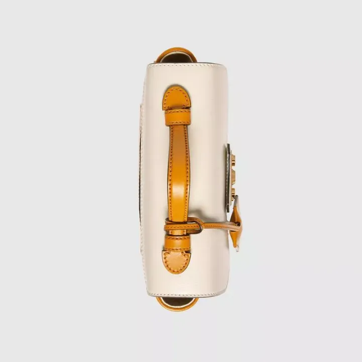 この南京錠シリーズのミニショルダーバッグは、コレクションのデザインから着想を得ており、InfiniteOvertureシリーズにもう1つの素晴らしい作品を追加しています。 ハンドバッグはホワイトレザーとGGスプリームキャンバスでできており、シリーズの象徴的なキーロックアクセサリーで飾られています。 鮮やかな焦げたオレンジレザーのパイピングがデザイン全体に魅力を添えています。