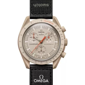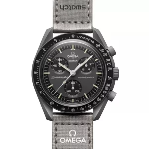 ブラックのVELCRO©ストラップが付いたこのスチールグレーの時計で(ほとんど)本気。すべての針とタキメーターの目盛がホワイト、オリジナルのMoonwatchと同じです。 すべての文字盤には、OMEGA X SWATCH…